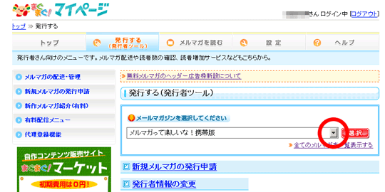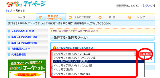 - 表示されたメルマガ一覧から、発行したいメールマガジンを選び、「選択」ボタンをクリックします。