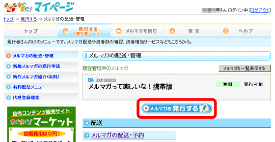 - 「メルマガを発行する」ボタンをクリックします。