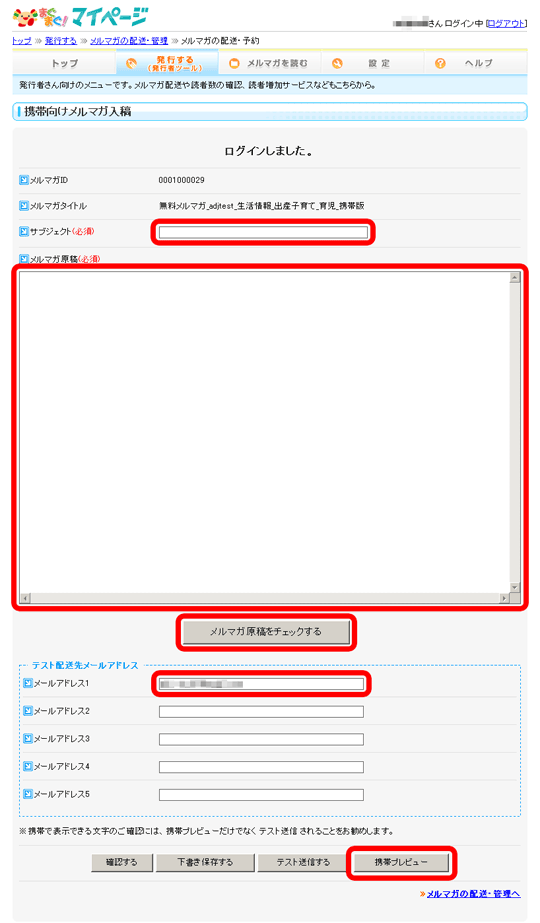 - サブジェクト、原稿、テスト配送先メールアドレスを入力し、「確認する」ボタンをクリックします。