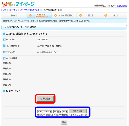 - 内容を確認し、即時配送する場合は、「今すぐ送る」をクリックします。