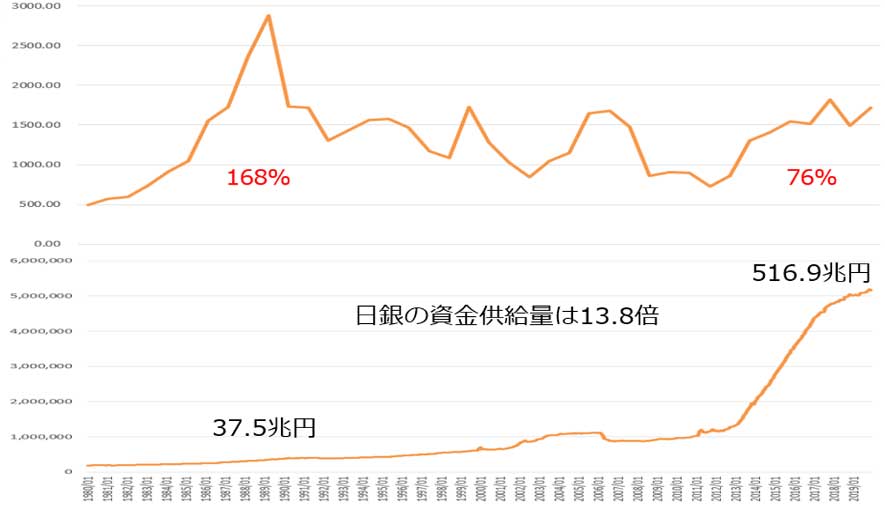 そこで、下の図11で、1980年から2019年までのTOPIXと通貨供給量の関係を見てみよう。