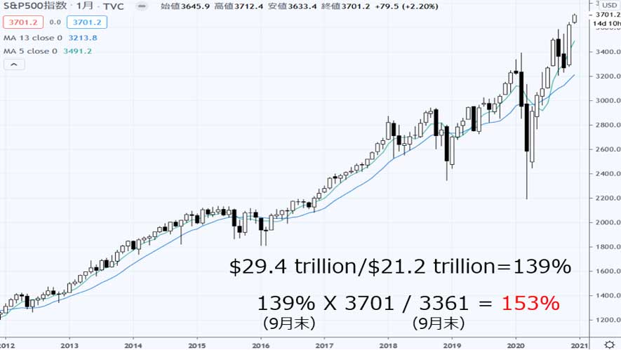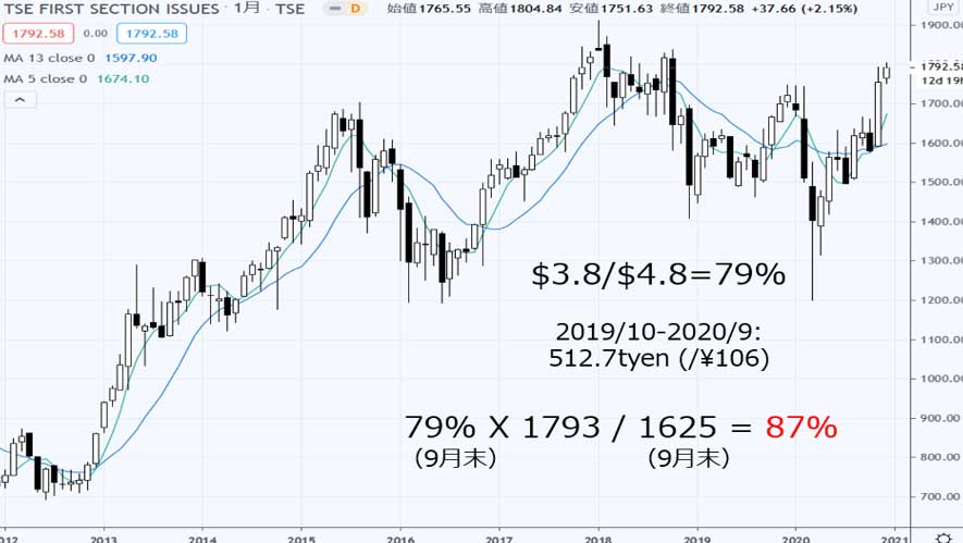 その後、TOPIXは1,625円から1,793円まで上昇したので、87%となった。直近のGDPは円建てではわずかに減少したが、若干円高に振れたので、9月末と変わらずと仮定した。