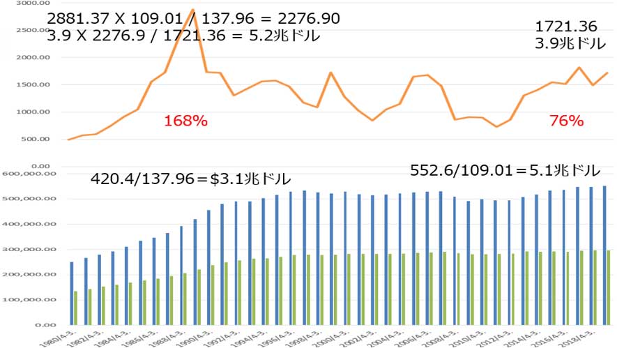 2019年末のTOPIXは1,721.36円で、当時の時価総額は3.9兆ドルだった。1989年の時価総額が分からないので、2019年の3.9兆ドルから推測するために、当時のTOPIX2,881.37円を為替で調整した2019年の価値2,276.90円から、時価総額を割り出すと5.2兆ドルとなる。