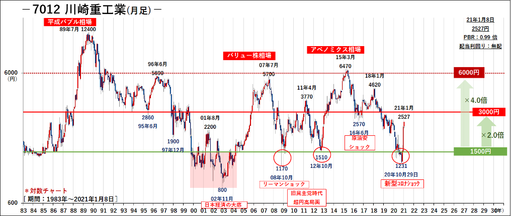 *川崎重工業<7012>の対数月足チャートでの大勢下限水準