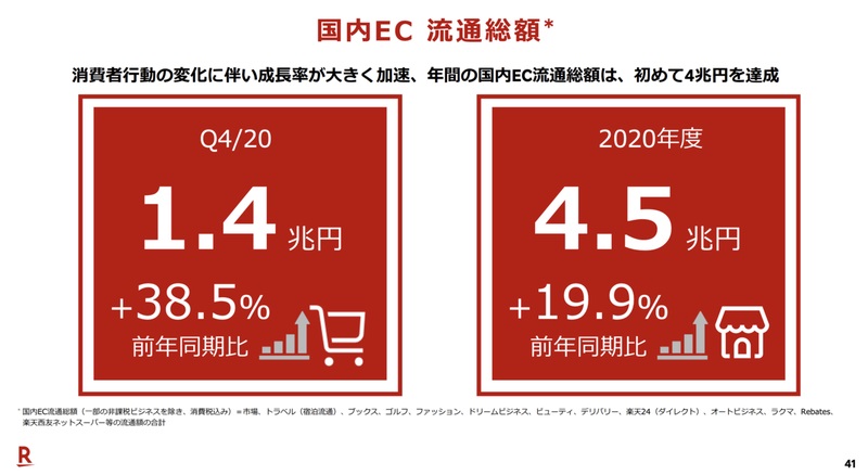 楽天の2020年10月‐12月四半期の国内EC事業の取扱高(GMV)は1.4兆円、前年同期比(YoY +38.5%)となりました。