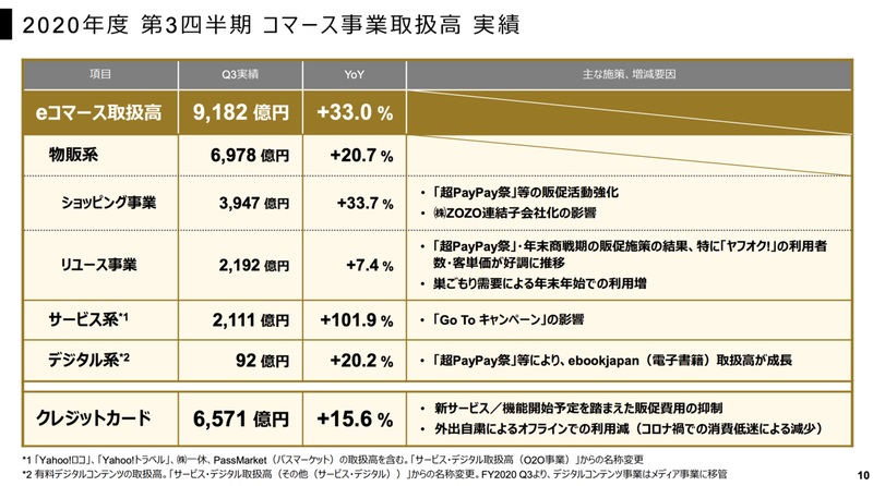 同四半期のヤフーのEコマース事業のGMVは9,182億円で、YoY+33.0%でした。
