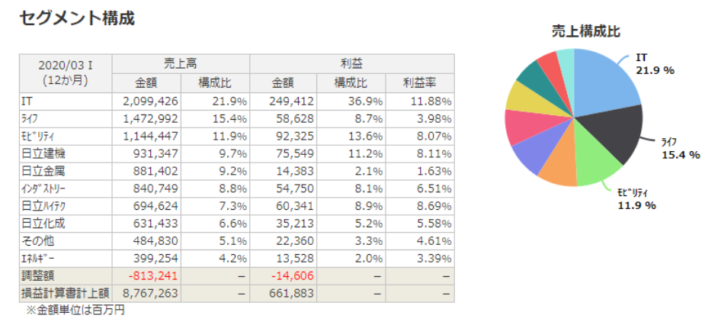 ITに関しては売上高は2割そこそこなんですが、利益で見ると36%と4割近いところを占めます。利益率も11%と他に比べてもかなり高い水準となっています。この日立ハイテクノロジーズは直近で子会社化したので、これを合わせるともう半分近い利益はITから上げているということになっています。