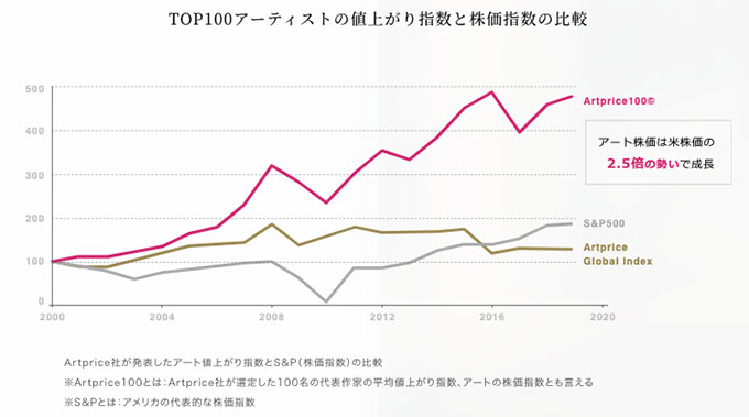 ピカソやバンクシーなど有名アーティストの作品価値は、米国の主要株価指数の1つである「S&P 500」以上のペースで値上がりしており、いまや多くの投資家が参入を検討しています。金・銀などと同様に実物資産としての価値をしっかり持ちながら、芸術作品を所有できるという喜びがあることも魅力となっています。