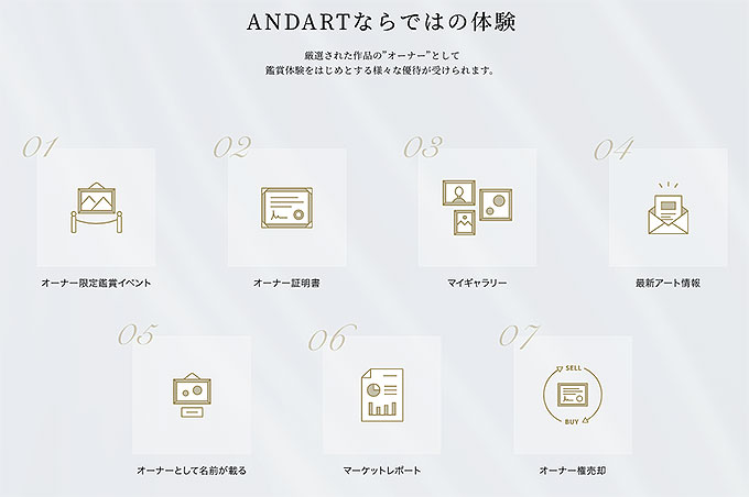 手が届かなかった有名アーティストの高額作品でも気軽にコレクションできるANDARTは、オーナー権を購入して作品オーナーとなることで、さまざまな優待を受けることができます。