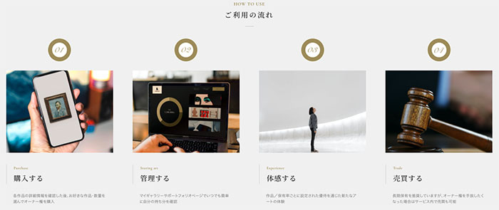 オーナー権を購入した作品オーナーは、オンライン上でのコレクションをはじめ、実物作品の鑑賞機会など様々な優待を通して、気軽に本格アートコレクションを楽しむことができます。また、オーナー権の売買が可能な会員間取引機能も提供されています。