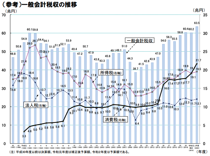 この右端には、2020年度(令和2年度)一般会計税収の当初の見込み額が書かれている。それぞれ、総税収が63.5兆円、消費税収が21.7兆円、所得税収が19.5兆円、法人税収が12.1兆円とされていた。