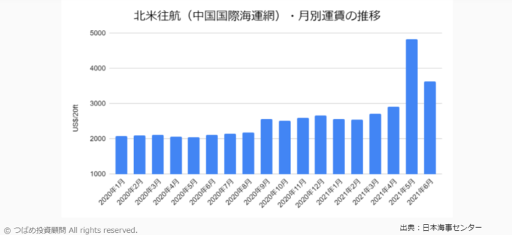 実際にこの北米往航の船賃ですが、なんとこの2021年5月に、それまで3.000ドルだったものが一気に4,900ドルというところになり、それまでもじわじわ上がっていたのですが、それまでの平均的な水準から2倍以上のところに上昇したというところになっています。