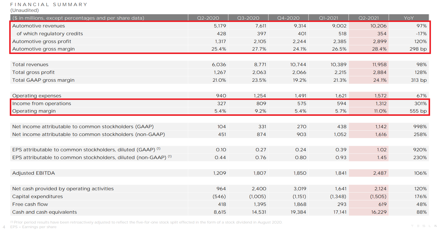 2021Q2の売上は$12B(約1.2兆円)でYoY+97%、粗利益は$2.9B(約2,900億円)でYoY128%となっており、粗利益率は24.1%です。営業利益は$1.3B(約1,300億円)でYoY+4倍、営業利益率は11.0%となっています。