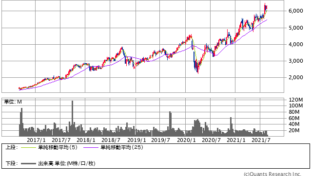 株価に関して過去5年のチャートなんですが、およそ4.5倍になるほど大きく伸びてきています。特にコロナで大きく下がった時からはもう2倍になっていると言うところです。