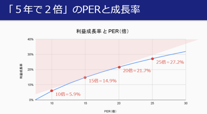 これはPER10倍の時に、利益成長が何パーセントあれば、5年で2倍が達成できるかというものです。