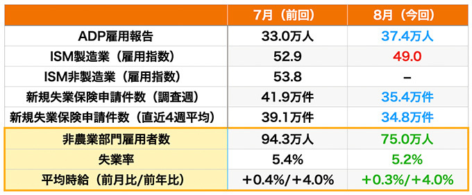 むしろ、ADP社が発表した雇用報告は2ヶ月続けて予想から大きく下振れしています。前回7月分は予想+69.5万人に対し、結果は+33.0万人。今回8月分は予想+61.3万人に対し、+37.4万人でした。