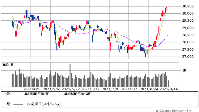 これを受けて日経平均株価は8月にかけてはコロナの状況というのもありましたから、ズルズル下がっていましたけれども、この菅総理の退任表明を受けて奇しくもぐんと上がって、一時は3万円を突破するというようなところに来ているわけです。