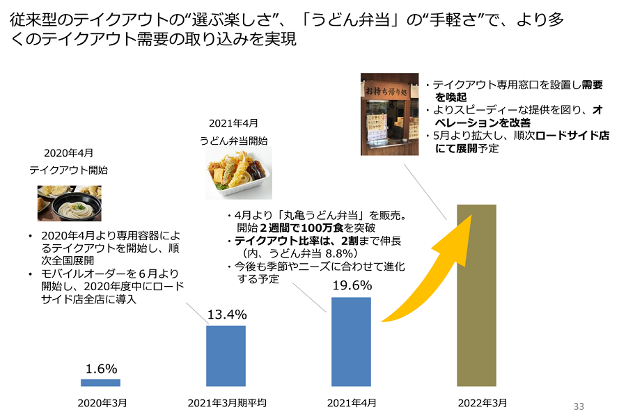 この時点でテイクアウト比率13%台でしたが、引き続き中食ニーズの取り込みを強化し続けていました。その中で、4月に新商品の「うどん弁当」を展開したことで、テイクアウト比率を20%台へ、グッと引き上げることに成功しています。