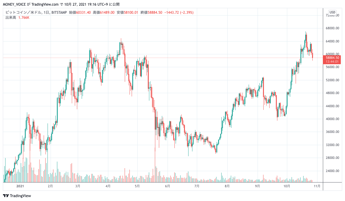 現在は少し下落しているものの、10月20日にはビットコインは6万6975ドル(約753万円)の史上最高値を記録した。