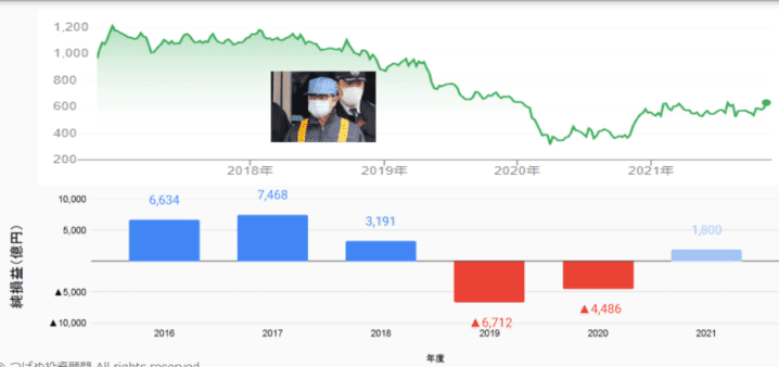 業績を見ると、これは純損益のグラフですが、ゴーン氏がいた時は見かけ上は利益を保っていたのですが、彼が退くやいなや、業績はみるみる下降をたどり、2019年度には6,700億円もの最終赤字、そして2020年はコロナ禍もありましたから、4,400億円もの最終赤字を計上しています。