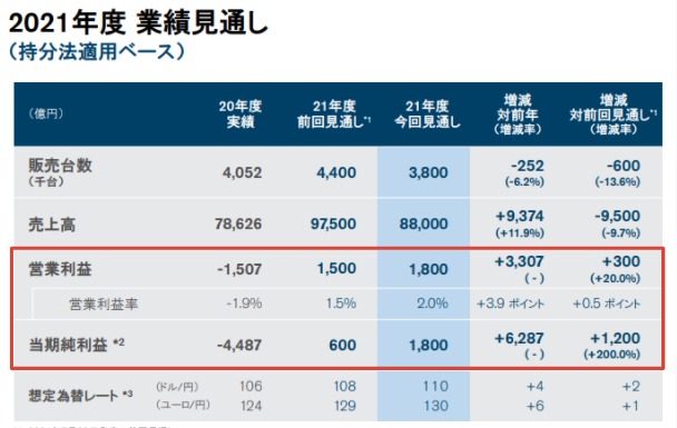ところが、今回の決算発表で示された見通しでは380万台と、当初の予想から14%も減少して、なおかつコロナ禍であった2020年度をも下回るという数字になっているのです。