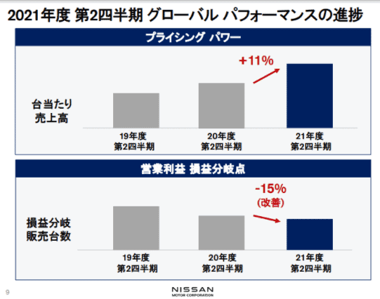 これでプライシングパワーが11%上昇しましたし、また生産の部分に関してもコスト削減努力を地道に行っていて、これが15%改善したことで、損益分岐点の販売台数が15%改善し、日産のゴーン氏なき後の改革というのは、着実に進んでいると見ていただいていいのではないかと思います。