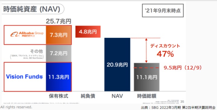 ソフトバンクグループというと時価純資産(NAV)、持っている株式の時価から負債を引いたもの、つまり財布にいくらお金が入っているかというと20.9兆円あります。