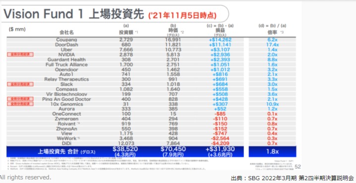 長期的な視点に立ち、ビジョン・ファンドの上場している分の投資先の投資した金額に対する倍率を見ると、結構順調な成績を収めていて、何倍にもなっている銘柄も少なくありません。一方で、10分の1になってしまった銘柄もあります。