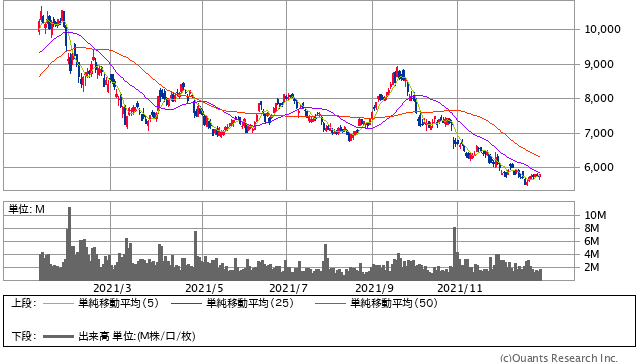 日本でGAFAMに対抗するような銘柄としては、エムスリー<2413>があります。2020年は大幅な上昇を遂げた銘柄でした。しかしながら、あまりに加熱しすぎてPERが100倍を超えるような状況になってしまいました。こうなると遅かれ早かれ株価は下落するものですから、やがてその転換点が訪れ、そこからはこの1年下落の一途となっています。