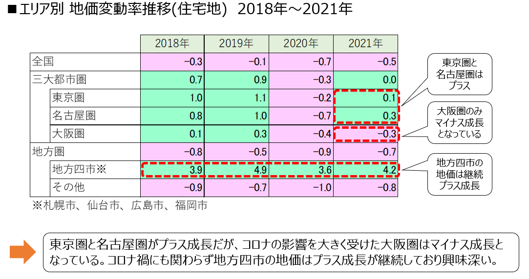 エリア別の地価変動をもう少し詳しく見ていくと、2021年の地価は、東京圏と名古屋圏はプラス、大阪圏はマイナスとなっています。あくまで統計上の推測ではありますが、大阪圏では人口に対しコロナの影響を大きく受けたため経済活動が縮小したことがわかります。