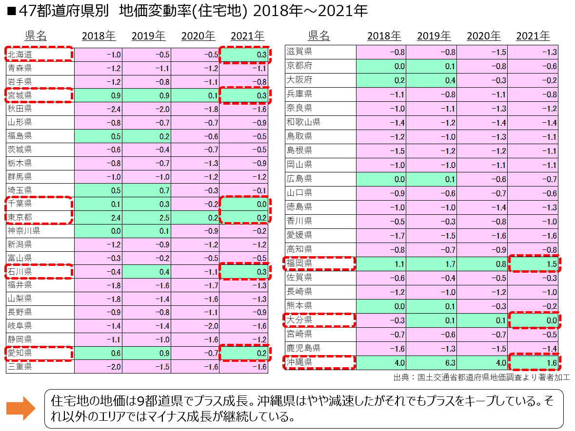各都道府県別でみていくと、北海道、宮城県、千葉県、東京都、石川県、愛知県、福岡県、大分県、沖縄県の9都道県でプラス成長をキープ。人口比でコロナの影響を大きく受けた沖縄県では、もともとのプラス幅が4~6だったものが、1台まで下がっているものの、それでもプラスを維持しており、今後も将来有望なエリアだと考えられます。これらのエリアに住んでいる方は、今後の地価上昇に備え、早めにマイホームを購入するのが吉といえるでしょう。