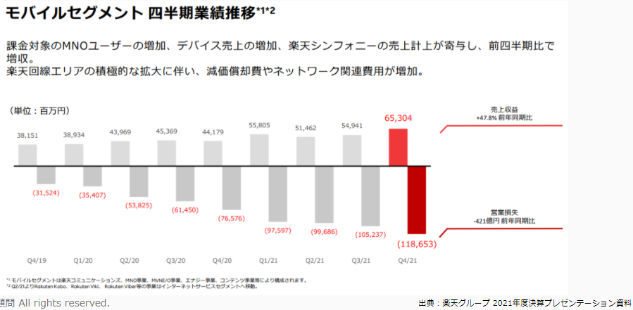 一部には物流投資もありますが、この赤字はほぼ全てモバイル事業の赤字であり、これをいかに黒字化するかが楽天にとっての至上命題となっています。