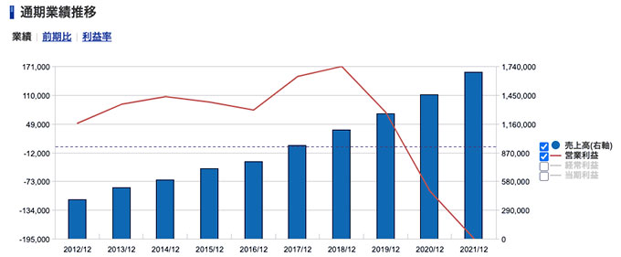 しかし、営業利益である赤の折れ線グラフは、モバイル事業に本格参入した2019年12月期にガクンと減り、翌年には赤字、2021年度も赤字という、目もあてられない状況となっています。