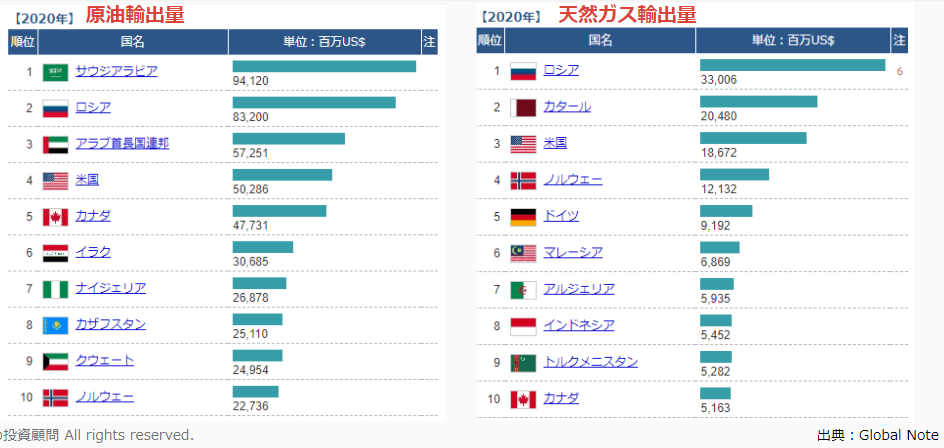 ロシアは世界有数の原油、天然ガスの輸出国なのです。原油というと中東のイメージが強いですが、ロシアはサウジアラビアに次いで2位、天然ガスに関しては世界1位の輸出量となっています。