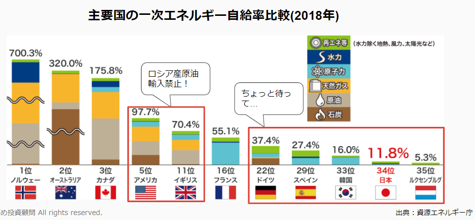 真っ先にロシア産の原油の輸入を停止すると言ったのがアメリカとイギリスなのですが、この2国はエネルギー自給率が非常に高いのです。
