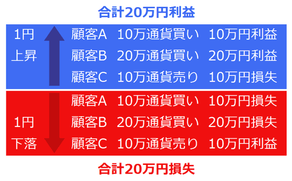 顧客の中にはロングポジションを持っている人とショートポジションを持っている人が両方いますが、トータルでロングポジションが超過であるときにレートが上にいけば顧客のトータル損益はプラスです。そのプラス分はまるまる全額がFX会社の損失になります。