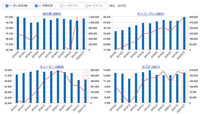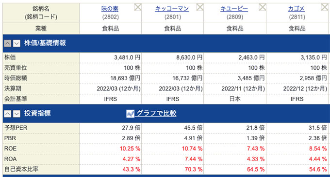 ただ、キッコーマンを含め全体に言えることは、株価が必ずしも安くなっていないというところがあります。PERの平均が15倍と言われる中で20~40倍ですから、そこまで下がっていません。