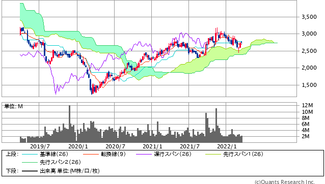 現在株価は、予想PER=9.17倍、PBR=0.51倍、予想配当利回り=4.33%という水準にあり、割安感は強い(※編注:原稿執筆時2022年3月25日11:00)。一目均衡表の週足「雲」上限が強い下値サポートとして意識されており、先週からは切り返しの動きが見られている
