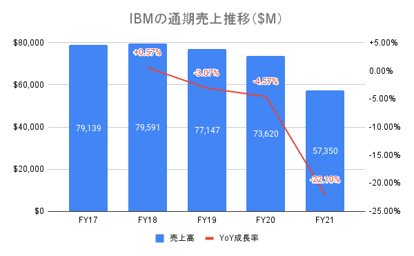 上のグラフはIBMの通期売上とYoY成長率の推移です。FY17(2017年度)の通期売上は$79B(約7.9兆円)で、そこから毎年微減が続き、直近のFY21は$57B(約5.7兆円)、YoY▲22.1%と一段と売上が減少しています。