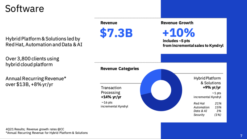 Software事業のFY21Q4の売上は$7.3B(約7,300億円)、YoY+10%、最も成長したRed HatはYoY+21%、自動化サービスはYoY+15%と、Software事業全体の成長に貢献しました。