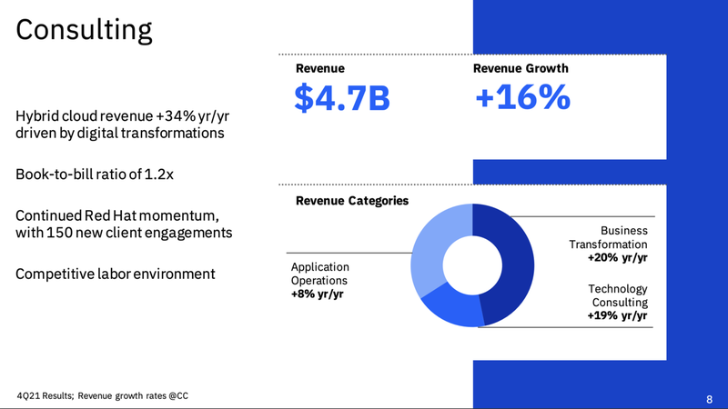 Consulting事業のFY21Q4の売上は$4.7B(約4,700億円)、YoY+16%と、Software事業を上回る成長率となっています。
