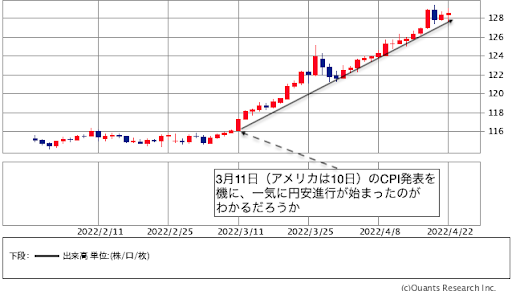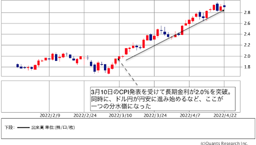 債権市場の参加者は、3月10日発表のCPIをみて、これは並大抵の金利引き上げや量的金融緩和縮小ではとても物価抑制(FRBのインフレターゲットは年間2%物価上昇)はできないと考えたのだろう。この日を境に、長短金利が共に上がっていった。