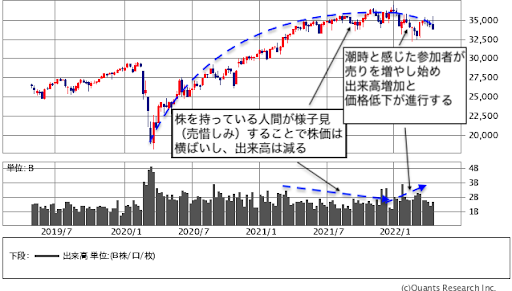 ※なおラウンドトップの特徴として、円弧状の値動きに加えて、下がり出すときに出来高が増えるという点がある。円弧の頂点で様子を見て売り控えていたプレーヤーが「潮時だな」と思って売りを増やすことで下げるからだ。NYダウの1月以降の出来高は冬場の出来高に比べて増加しており、ラウンドトップの特徴どおりと言える