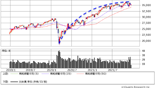 天井圏を示唆するパターンとされる「ラウンドトップ」のようなチャートを描きつつあると。仮にラウンドトップが継続して平行移動期間を過ぎて「株価が下がっていく」とするなら、過去の経験則に照らし合わせると、下落は春にも予想されるQT開始から少し時間が経ってからになるのではないか?とも書いた。