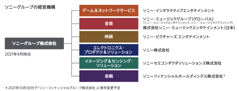 現在では、上図のように、2つのハードウェア事業と4つのソフトウェア事業、合わせて6つの事業会社をソニーグループが保有する形で運営しています。