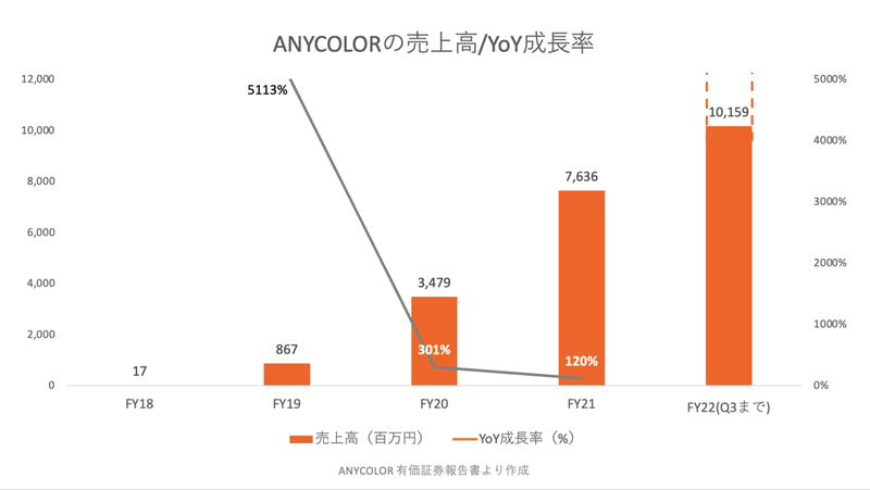 上図はANYCOLORの売上と成長率の推移です。2017年の創業以来、急成長していることは一目瞭然です。