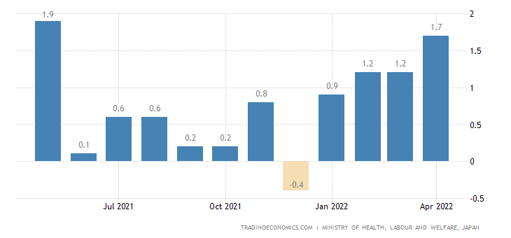 賃金も前年比で大きく上昇しています。といってもアメリカの5%と比較すれば大したことはありませんが。この発表は6月6日に発表されたものです。