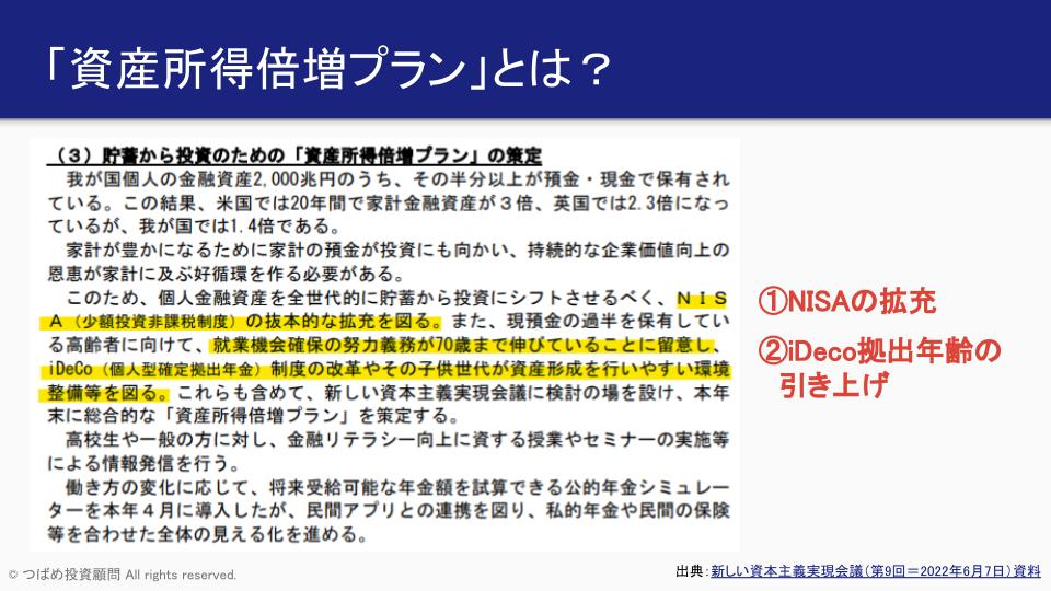 資産所得倍増プランというのは、分かりやすく言うと貯蓄から投資に移行させたいというプランです。岸田総理が掲げている看板政策『新しい資本主義』の中の1項目として出てきます。