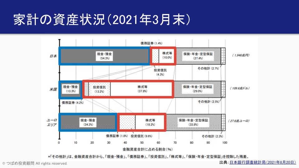 実際の家計の資産状況を見比べてみると、日本の株式等はわずか10数%に対して米国では50%程度、ヨーロッパでも30%近くあります。日本の残りの資産は預金が50%以上となっており、欧米と比べても偏っている状況です。