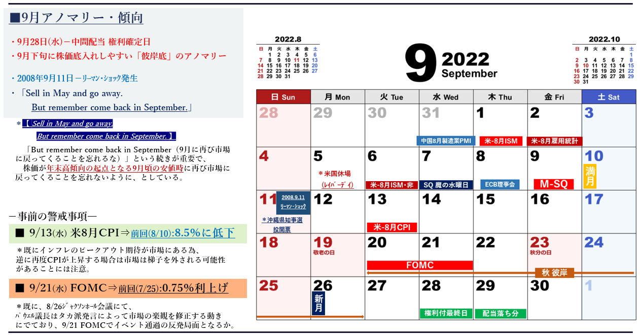 しかし、想定通りの下げとなった場合には、そこは9月下旬に株価が底入れしやすい「彼岸底」のアノマリーと一致、また9月28日(水)の権利付最終日に向けての中間配当取りに向けた買いが入りやすく、少なくとも短期的な買いの好機となってくる。